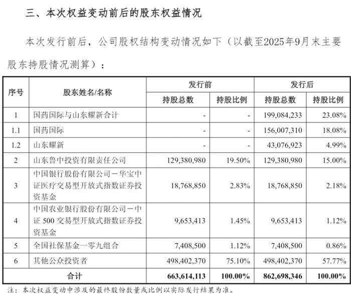发行完成后,国药国际与山东耀新合计持股比例将达23.08%,超越原控股股东鲁中投资的19.50%,山东药玻的实际控制人将变更为国药集团,最终控制人为国务院国资委。